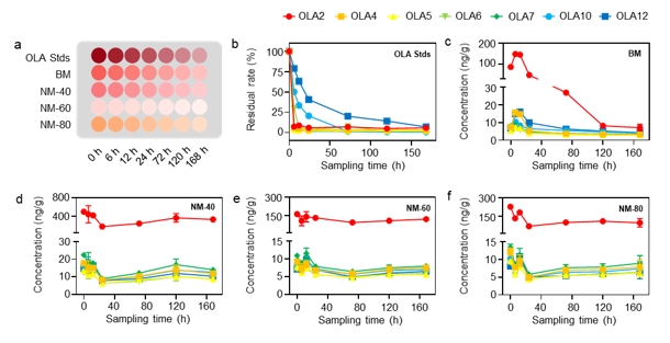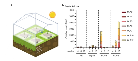 3.模拟与实地研究,揭示OLAs动态变化:团队在实验室模拟土壤环境,研究商用PLA产品中OLAs的释放和降解情况。实验结果显示,PLA产品在24小时内释放大量OLAs并达到峰值,随后逐渐降解,不同聚合度的OLAs降解速率存在明显差异,高聚合度的OLAs在土壤中稳定性更强。同时,团队在上海闵行区的温室大棚进行了为期一年的实地研究,对使用不同地膜的土壤进行采样分析。结果发现,PLA基可降解地膜下的土壤中存在OLAs长期残留,最高浓度可达16.10 ± 0.37 ng/g,且不同地膜的OLA释放和积累趋势因PLA含量、分子量和材料性能的不同而有所差异。