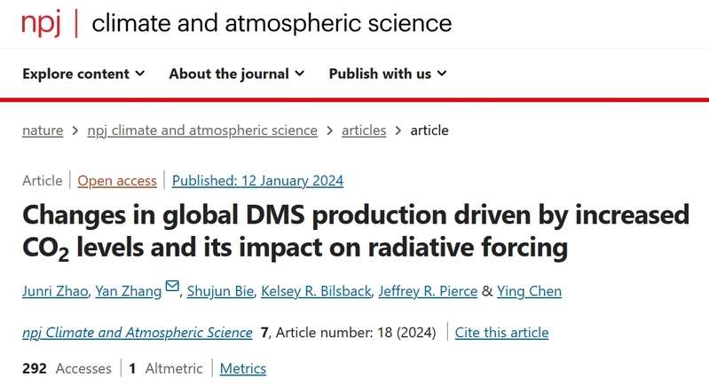 论文信息:Zhao, J., Zhang, Y., Bie, S. et al. Changes in global DMS production driven by increased CO2 levels and its impact on radiative forcing. npj Clim Atmos Sci 7, 18 (2024). //doi.org/10.1038/s41612-024-00563-y