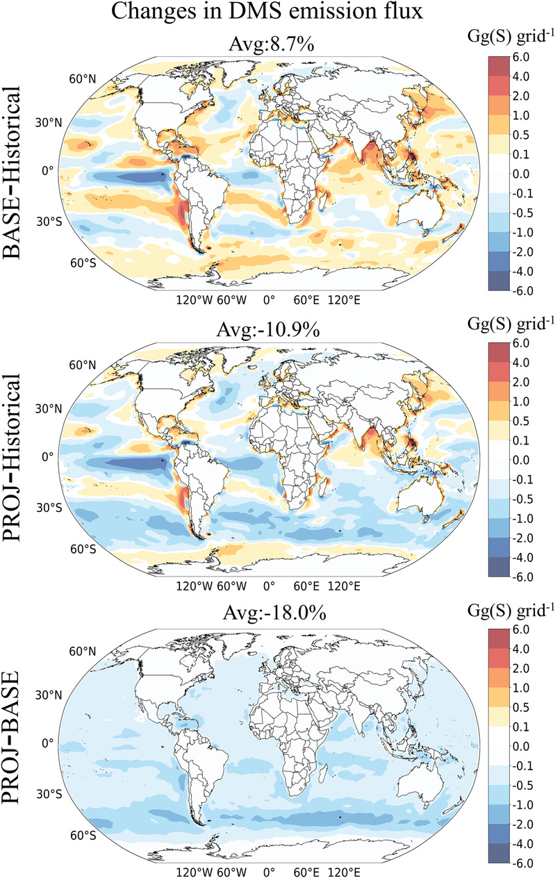 图2. 全球表层海水中DMS浓度在历史期间(Historical)、CMIP6模式预测结果(BASE)和本研究预测(PROJ)结果中的差异