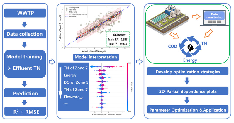 研究团队收集了浙江省某采用ECPs城市污水处理厂连续三年的运行数据,通过可解释机器学习方法对出水总氮浓度进行预测并优化。XGBoost模型的训练集和测试集R²分别达0.997和0.911,RMSE分别为0.196和1.283。通过SHAP分析与偏依赖图解析,确定提升脱氮效能兼顾能耗与COD投加量同时降低的最优运行参数,并开发友好型图形用户界面,实现工艺运行参数的实时预测和协同优化,同步降低出水TN、能耗和外碳源使用量。运行参数优化后,出水TN浓度年均降低17.50%,同时COD投加量年均减少33.29%。采用ECPs的污水处理厂展现出显著的碳减排潜力,仅通过强化脱氮、降低能耗与外碳源投加,年碳减排量可达788.40吨CO₂。