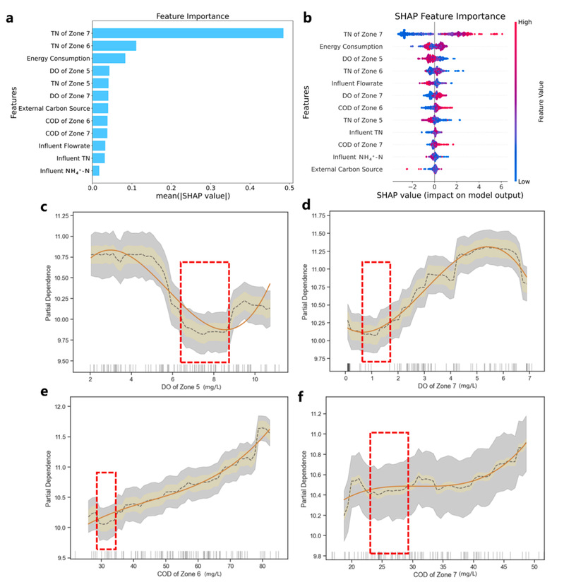 图3. (a) XGBoost模型预测出水总氮的特征参数重要性排序;(b) XGBoost模型的SHAP重要性分析;(c)5区溶解氧 (DO)的偏依赖图;(d)7区溶解氧 (DO)的偏依赖图;(e)6区化学需氧量 (COD)的偏依赖图;(f)7区化学需氧量 (COD)的偏依赖图。