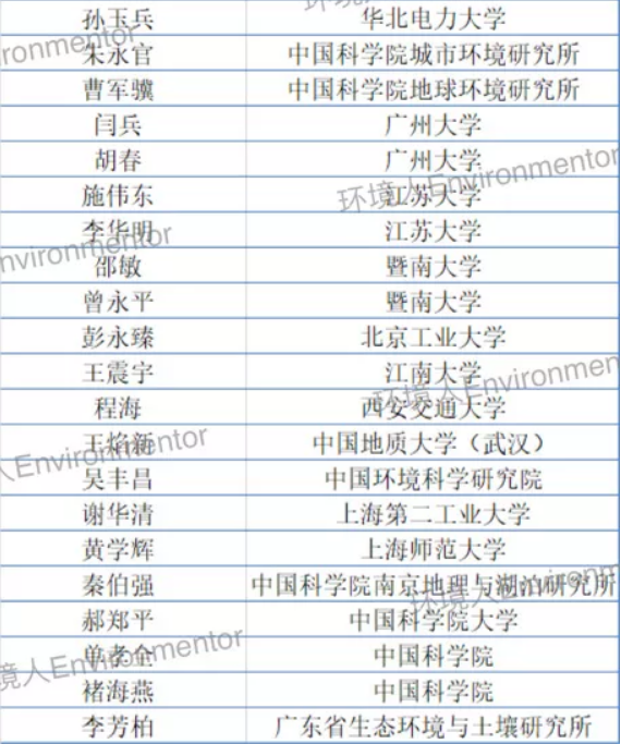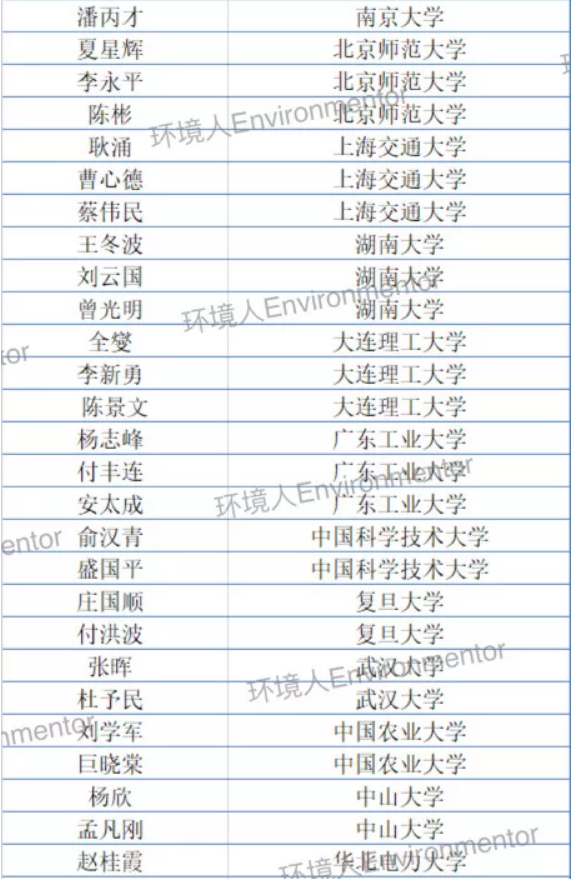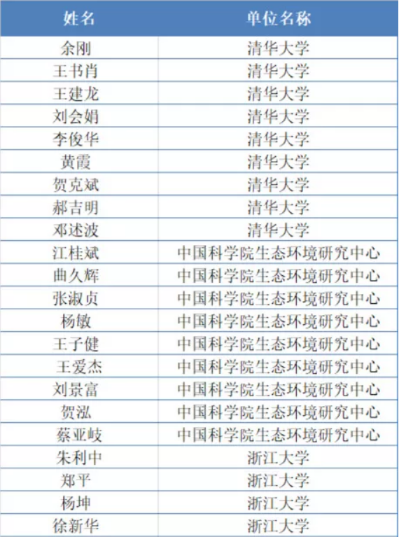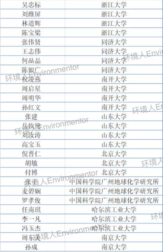 本次共有4023位学者入选,其中环境科学与工程学科97人入选,中国科学院18人名列榜首,其后依次为清华大学(9人)、浙江大学(8人)、同济大学(4人)、南开大学(4人)、山东大学(4人)、北京大学(3人)、哈尔滨工业大学(3人)、南京大学(3人)、北京师范大学(3人)、大连理工大学(3人)、上海交通大学(3人)、湖南大学(3人)、广东工业大学(3人)、中国科学技术大学(2人)、中山大学(2人)、blh漫画 (2人)、武汉大学(2人)、中国农业大学(2人)、暨南大学(2人)、华北电力大学(2人)、广州大学(2人)、江苏大学(2人)、北京工业大学(1人)、江南大学(1人)、西安交通大学(1人)中国地质大学(武汉)(1人)、上海师范大学(1人)、中国环境科学研究院(1人)、广东省生态环境与土壤研究所(1人)。
