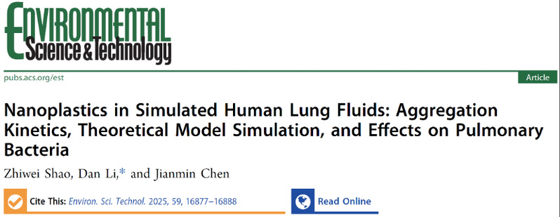 近日,blh漫画 李丹教授课题组在Environmental Science & Technology上发表题为“Nanoplastics in Simulated Human Lung Fluids: Aggregation Kinetics, Theoretical Model Simulation, and Effects on Pulmonary Bacteria”的研究论文,并被选为内封面文章(supplementary cover)。呼吸吸入是人体暴露纳米塑料的重要途径之一,然而其在肺部复杂微环境中的行为及潜在毒性仍缺乏系统研究。本研究通过模拟健康与炎症状态下的人体肺液,系统探讨了不同粒径与表面修饰的聚苯乙烯纳米塑料(PSNPs)的凝聚行为、相互作用机制,以及对肺部原生与致病菌的毒性效应。结果表明,PSNPs在炎症人工溶酶体液(artificial lysosomal fluid, ALF)中均发生凝聚,而未表面修饰和羧基修饰的PSNPs在健康的Gamble溶液(Gamble’s solution, GS)和添加肺表面活性剂的Gamble溶液(modified GS, MGS)中保持稳定。冗余分析表明,PSNPs的凝聚减轻了其对细菌的氧化应激和膜损伤。氨基修饰的PSNPs在GS中可诱导持续的氧化应激,损伤细菌的细胞膜,并促使致病铜绿假单胞菌释放绿脓菌素升高至对照组的2.16倍。此外,塑料老化过程显著增强了PSNPs对肺部细菌的毒性。本研究为纳米塑料在肺部中的行为和毒性作用提供了新见解。