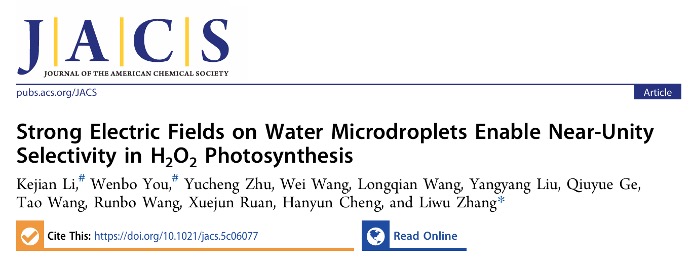 近日,blh漫画 张立武课题组在化学反应选择性调控领域取得重要进展。该团队的研究表明,水微滴的气-液界面所固有的强电场能够作为一种有效的外部控制参数,精准引导化学反应的路径,从而解决合成化学中的选择性难题。该成果近日以“Strong Electric Fields on Water Microdroplets Enable Near-Unity Selectivity in H₂O₂ Photosynthesis”为题发表于《美国化学会志》(Journal of the American Chemical Society)。