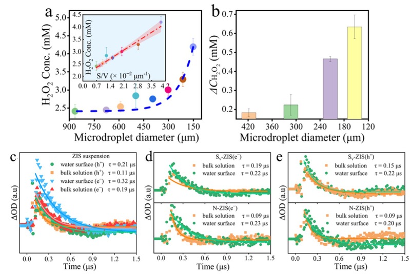 图1: (a) 不同尺寸微滴中的光化学H2O2产量及其与比表面积(S/V)的关系; (b) 空气环境下不同尺寸微滴中H2O2浓度变化(初始H₂O₂浓度4 mM, TEOA 20 mM); (c-e)不同区域光生电子与空穴的纳秒瞬态吸收光谱(NTAS),其结果表明气液界面强电场能够促进光生载流子分离。