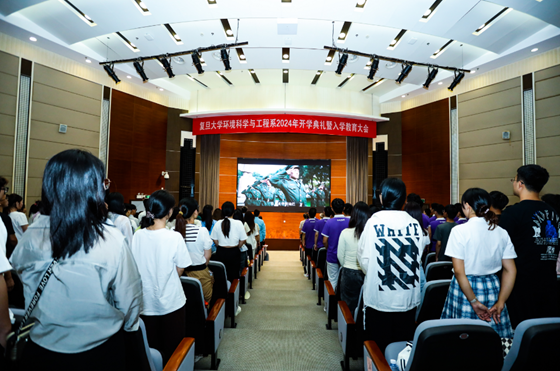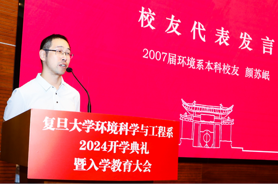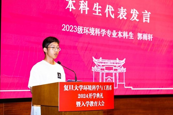 2023级本科生郭雨轩作为本科生代表发言,他回顾了选择环境专业的初衷,来自大山深处的他从小就对大自然特别亲近,进入复旦后,从参观实验室、修读通识课程,到参加 “环境人节”志愿服务,他对环境专业的认识和热爱不断加深。他立志不断努力,提高专业素养,未来投身环保事业,为保护美丽家园贡献自己的力量。