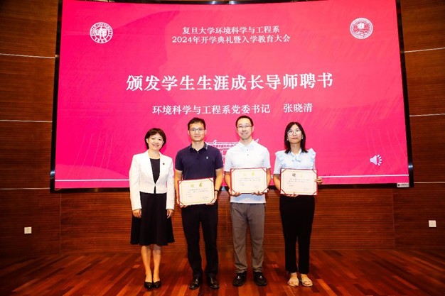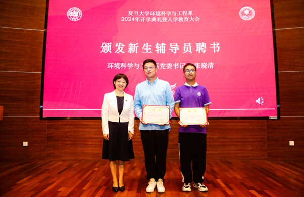 今年环境系选派人才工程队员刘品皓、专职辅导员吴旭炀、青年教师蔡润龙分别担任2024级环境系本科生、硕士生、博士生班级辅导员。系党委书记张晓清为2024级新生辅导员颁发聘书。