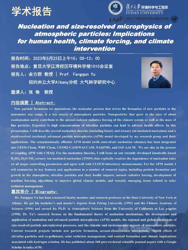 【学术报告】Nucleation and size-resolved microphysics of atmospheric particles: Implications for human health, climate forcing, and climate intervention
