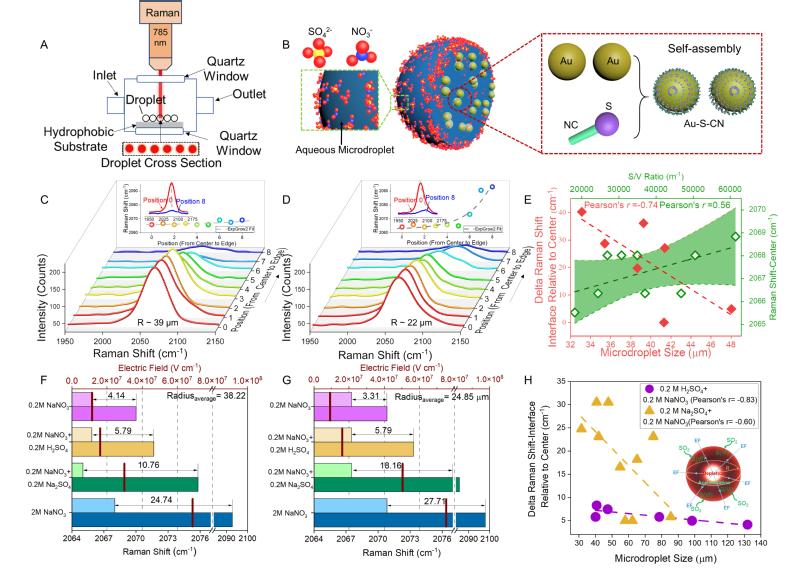 (A)用于研究电场的SERS装置示意图,以及与(B)探针分子NaSCN自组装的Au粒子示意图。(C) R = ~39 μm和(D) R = ~22 μm的硝酸盐气溶胶微滴内部拉曼位移的空间特征。(E) 拉曼位移作为液滴大小的函数和中心拉曼位移作为比表面积的函数校正分析。在(F) R = ~39 μm和(G) R = ~22 μm条件下,研究了H2SO4和Na2SO4对原始NaNO3电场的影响,与高浓度NaNO3的比较。(H)拉曼位移与液滴尺寸的线性分析。