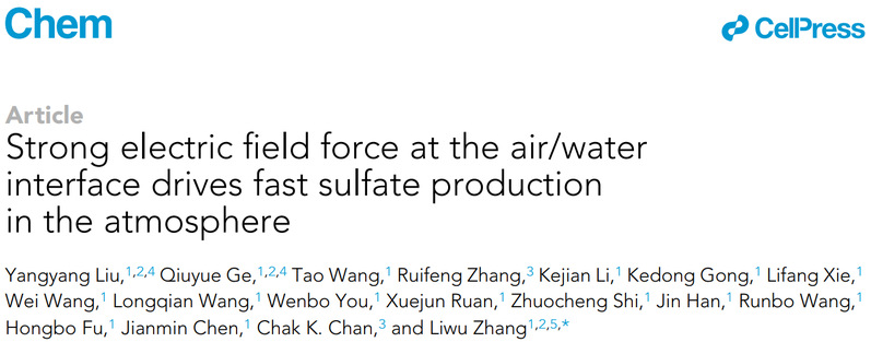近日,blh漫画 张立武团队在大气化学领域取得重要研究进展。利用共聚焦表面增强显微拉曼光谱为研究手段,在大气气溶胶气-液界面效应加快二次硫酸盐形成机制的研究中取得重大突破。通过实验室模拟,数值计算以及理论计算揭示了气溶胶气-液界面强电场是加速大气二氧化硫氧化的重要驱动力,推进了气-液界面促进大气化学过程的更深层次理解。研究成果以“Strong electric field force at the air/water interface drives fast sulfate production in the atmosphere”为题,于近日发表于Cell姊妹刊《化学》(Chem)期刊上。