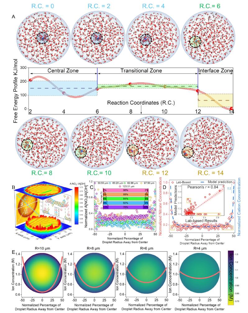 (A)气溶胶微滴中NO3-表面倾向的MD模拟。(B) NO3-在直径为~50 μm的NaNO3微滴赤道截面上的二维分布。(C)不同S/V下NO3-([ANO3-]/A[OH])归一化浓度。(D)硝酸盐浓度的实验室观测与模型预测之间的线性拟合。(E)通过二维电场建模得到离子浓度空间分布的投影图和相应的等高线图。