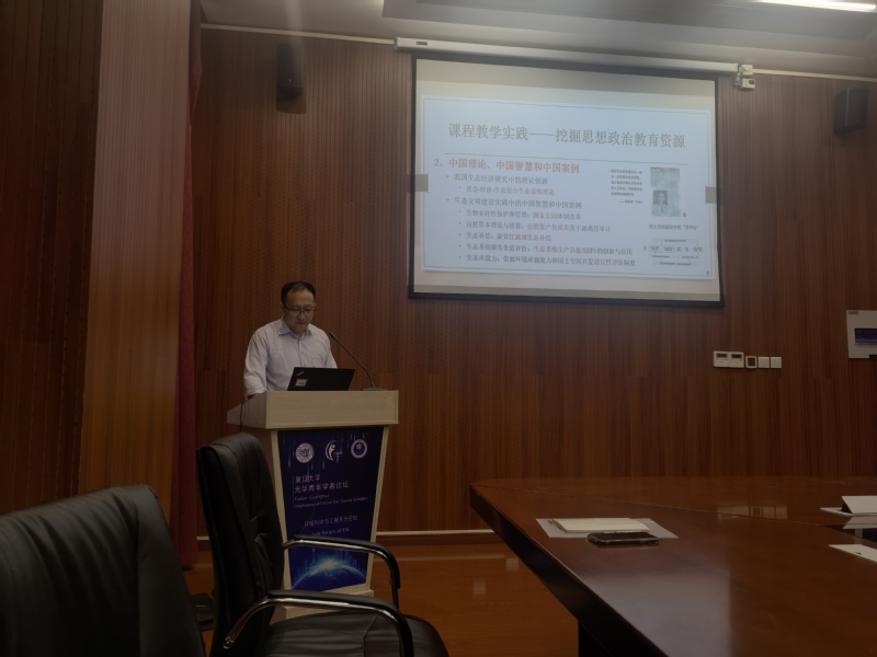 接着,环境工程教研室的张继彪副教授讲解了《生态工程》课程思政设计。他提出将思政内容和专业知识传授相融合的三个方法,即:仰望星空,将生态工程课程内容与生态工程前沿进展相结合;脚踏实地,将课程内容与教师工程实践相结合;师生互动,课上课下互动,深入挖掘课程中生态文明元素。