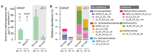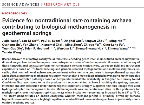 本研究以云南腾冲热泉为研究对象,利用C13同位素示踪技术、野外原位实验和长期监测,和异位微宇宙实验,结合宏基因组与宏转录组学揭示了非传统型产甲烷古菌在高温热泉中的效用。研究发现:非传统型产甲烷古菌是高温热泉中主要的甲烷产生者,古丸菌目(Archaeoglobales)同时具有氢营养和甲基营养型产甲烷通路,可代谢甲醇并产生甲烷,其编码的两种产甲烷途径(甲醇和氢气)的变化主要受温度驱动,低温下(65 °C)采用氢营养型途径用于产甲烷,而在高温环境中(75 °C)采用甲基营养性代谢通路,并随着温度和底物的改变呈现不同的适应性,升温导致甲基化合物比氢气更受微生物的青睐。此外,哪吒古菌(Candidatus Nezhaarchaeota)具有氢气营养型产甲烷代谢通路,其原位较高的丰度表明哪吒古菌有相当可能性是原位环境中主要的产甲烷贡献者。该研究证明了在高温热泉生态系统中,甲烷生成主要由非传统型产甲烷古菌驱动,揭示了各种含有mcr基因的非传统古菌是以前未被识别的甲烷来源。