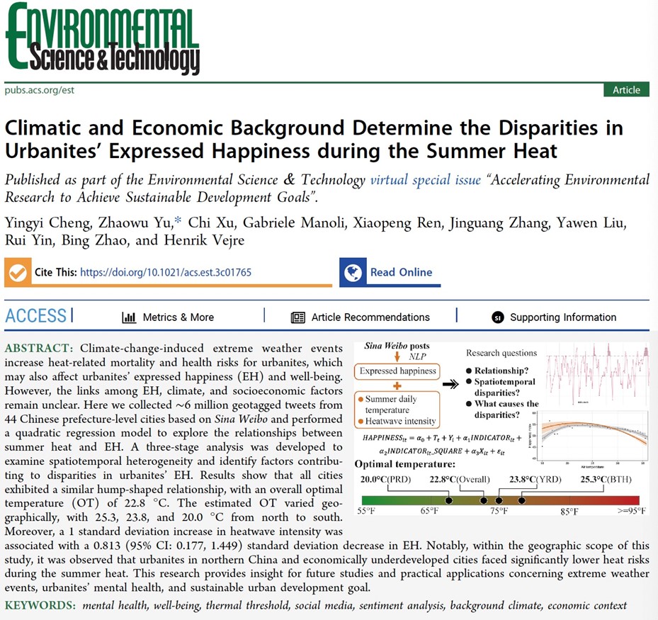 本研究以“Climatic and economic background determine the disparities in urbanites’ expressed happiness during the summer heat”近期发表于ES&T。本研究第一单位为blh漫画 ,合作单位还包括丹麦哥本哈根大学、瑞士洛桑联邦理工学院、南京大学、中国科学院心理所、南京林业大学等。本研究得到国家自然科学基金面上项目、上海市浦江学者项目、上海市自然科学基金面上项目、中国生态学学会生态学青年托举人才等项目资助。