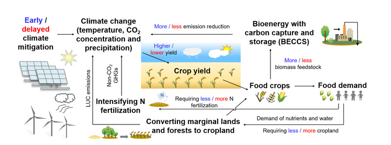 巴黎协定将本世纪末气候变暖的目标限制在2°C以内。为达到该目标,许多未来减排情景假设在本世纪下半叶,即在前期放缓减排步伐、甚至多排放一点,短期内超过既定的温度目标(称为“过冲”,英文为“overshoot”),然后通过实施大规模负碳减排技术如BECCS实现短时间气候减排,作物秸秆是清洁的生物质能源的重要来源,而秸秆生物量的多少受气候变化的影响。当全球大规模气候行动推迟时,未来农作物亩产量受气候变化的影响增加,可提供BECCS的生物质(主要为作物秸秆)产量下降,从而削弱BECCS的减排潜力,同时粮食减产导致需要农业土地的面积扩大,农业土地的温室气体排放增加,进一步加剧气候变暖后果。这种气候变化与BECCS减排潜力的反馈机制在目前的综合评估模型(IAMs)中被忽略,而该反馈机制对评估农业-气候变化的相互作用、认识气候-经济耦合系统中的气候变化临界点,以及评价各国为达到巴黎协定气候目标制定的减排承诺的有效性,有重要的科学意义。