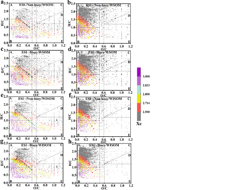 图2. Van Krevelen 图。原始大气条件下ESI-(a)和ESI+(b)的VK图,雾霾大气条件下ESI-(c)和ESI+(d) VK图,非雾霾WISOM条件下ESI(e)和ESI+(f)的VK图,雾霾WISOM条件下ESI-(g)和ESI+(h)的VK图。图中所示区域为A -脂肪族基团(H/C≥1.5, O/C≤0.5),B低氧化芳香族化合物(H/C≤1.0, O/C≤0.5),C -高氧化功能化合物(OSc ≥0, O/C≥0.6)包括酸、酯、过氧化物等,D -高还原功能化合物(OSc<0, O/C≥0.6)含有羧基等,e -中度氧化功能化合物(OSc≥0, O/C≥0.6, H/C≤1.2)。